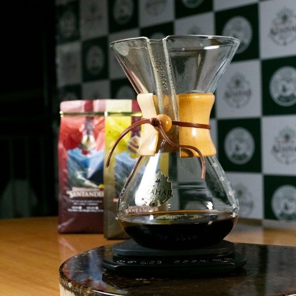 La Chemex es tanto el nombre de la cafetera como del método de preparación que utiliza. Consiste en un recipiente de vidrio con forma de reloj de arena, un filtro de papel grueso y un collar de madera con un lazo de cuero. El filtro, más grueso que los filtros de papel tradicionales, ayuda a retener los aceites y sedimentos del café, resultando en una taza limpia y brillante.