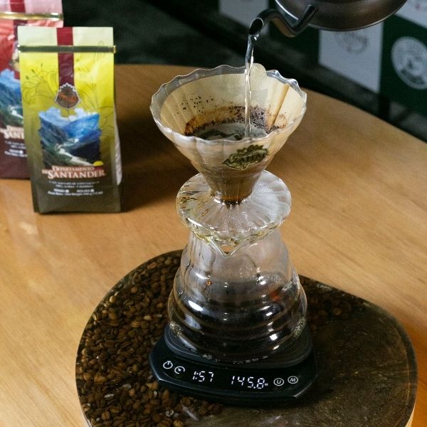 Extracción: Se vierte el resto del agua caliente lentamente y de forma circular sobre el café, evitando tocar las paredes del filtro.